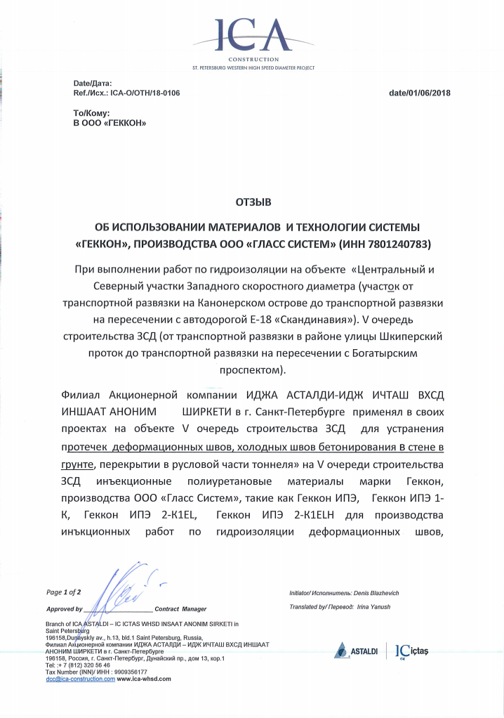 Многофункциональный комплекс "Лахта центр" успешно сотрудничает с ООО «Гласс Систем» по инъекционной и обмазочной гидроизоляции подземных сооружений, устройству промышленных полиуретановых полов, устройству бесшовной наливной полиуретановой кровли. Работы выполнялись с использованием материалов линейки «ГЕККОН». Предложенные технологии и используемые материалы показали себя эффективными и надежными.